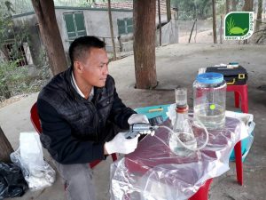 Nguyen Van Trong of the ATP/IMC processes water samples by the lake ready for the eDNA testing. Photo by: Nguyen Tai Thang – ATP/IMC.