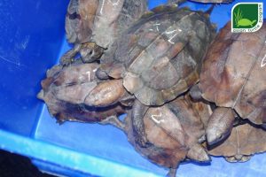 As it turned out the traders apparently had a permit that claimed approximately half of the confiscated animals were legal captive-bred, including most of the big-headed turtles. Those who know the species would know this is very doubtful, they are difficult to keep and are rarely bred. The documentation permitting the trade in these animals was issued by Tam Nong district Forest Protection Department (Dong Thap province, southern Vietnam) without permission from the CITES management authority for Vietnam. The remaining 75 turtles (5 species), weighing 50.2kg, were illegally traded.