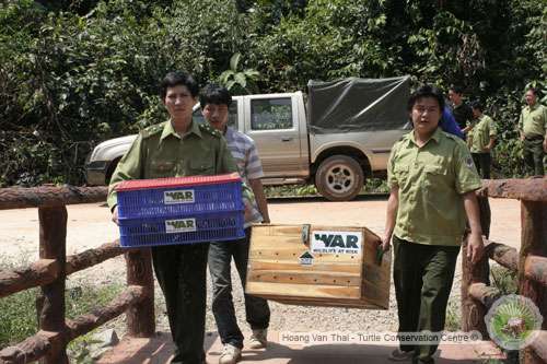 On the 24th of February 2012 the Turtle Conservation Center (TCC) of Cuc Phuong National Park transferred 186 turtles to the Cu Chi Wildlife Rescue Station in southern Vietnam, a project of Wildlife at Risk (WAR). The shipment included Elongated tortoises (Indotestudo elongata), Giant Asian pond turtles (Heosemys grandis), Yellow Headed Temple turtles (Heosemys annandalii), South Asian box turtles (Cuora amboinensis) and Black Marsh turtles (Siebenrockiella crassicollis) which are all native to central or southern Vietnam.