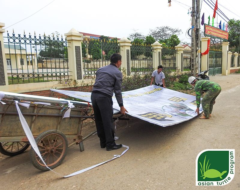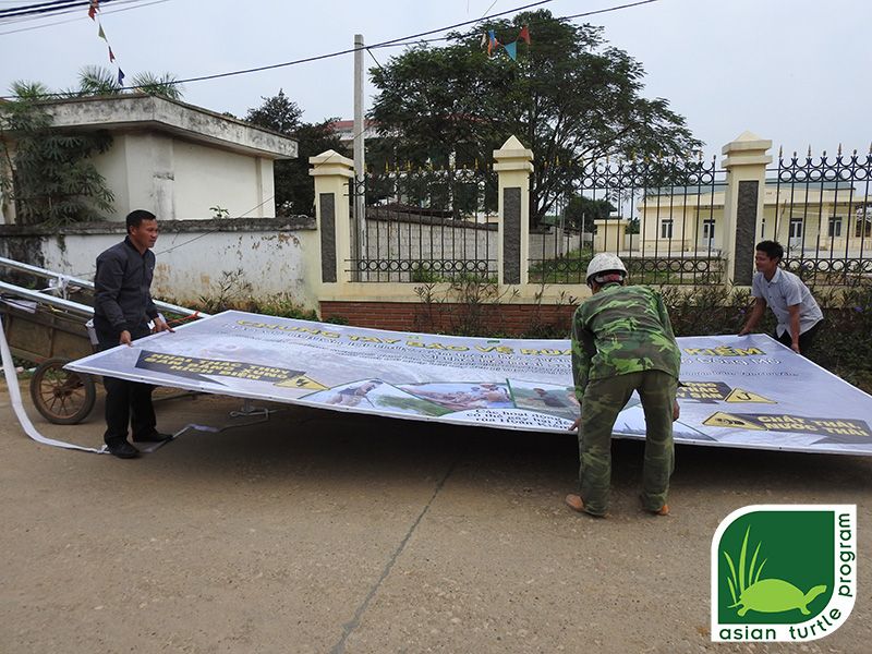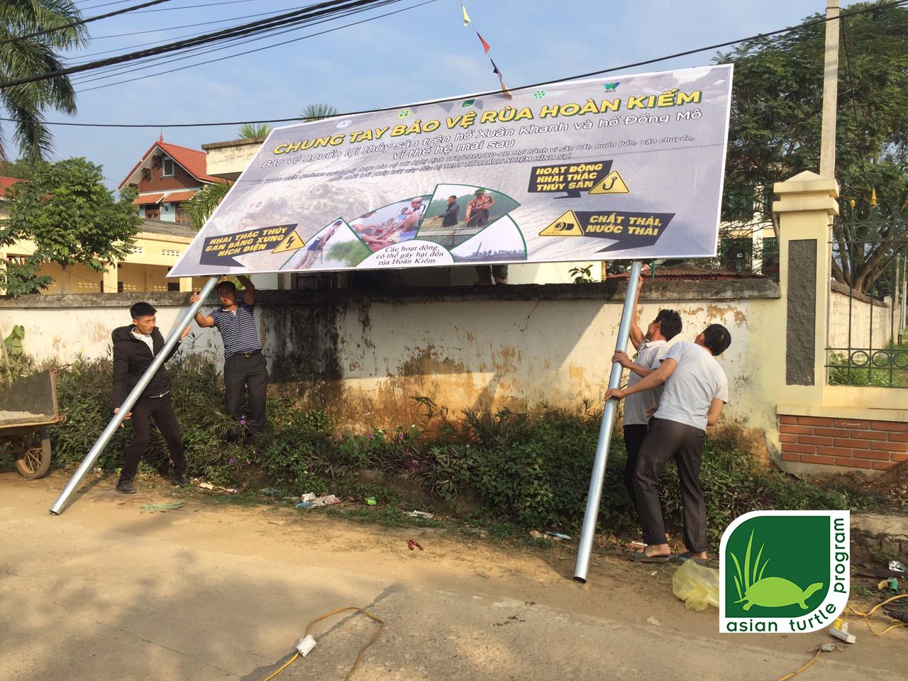 With this in mind, on 30th December 2019, ATP/IMC coordinated with the Ha Noi Fisheries Department to set up an educational signboard in front of the community house (the cultural and sports center of Phu Yen village), helping people easily access information of signpost. The signboard calls for local people to join hands to protect Hoan Kiem turtle, as well as highlighting some activities which negatively impact on this species. Local authorities and people have actively supported ATP/IMC during the process of building this signboard, and we hope it will be read and celebrated by the whole community.