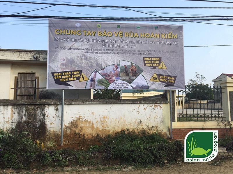 The new signboard raises awareness of harmful fishing practices and the protected status of Swinhoe's Softshell Turtles in Dong Mo Lake